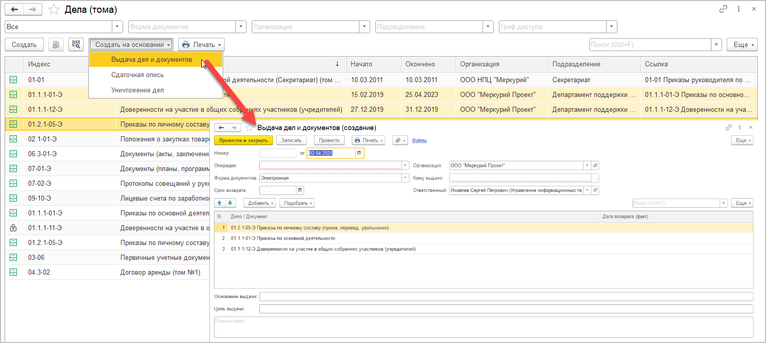 ■ Команда Выдача дел и документов в меню Создать на основании списка дел. При ее выполнении открывается карточка новой выдачи с добавленными делами, заполненными реквизитами Организация и Форма документов. Доступно множественное выделение и добавление дел.