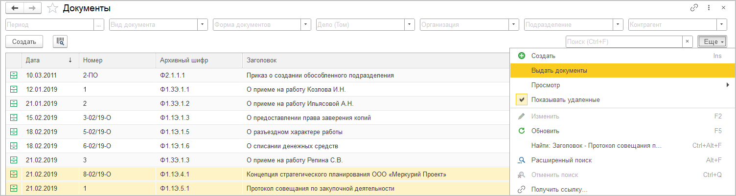 ■ Команда Выдать документы в меню Еще и контекстное меню списка документов. При ее выполнении открывается карточка новой выдачи с добавленными документами, заполненными реквизитами Организация и Форма документов.