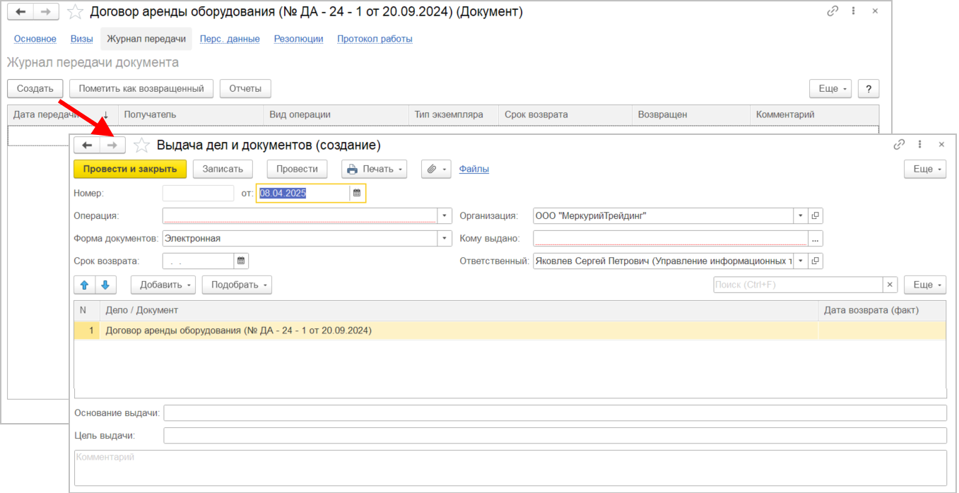 ■ Команда Создать – Выдача дел и документов на закладке Журнал передачи карточек дел и документов.