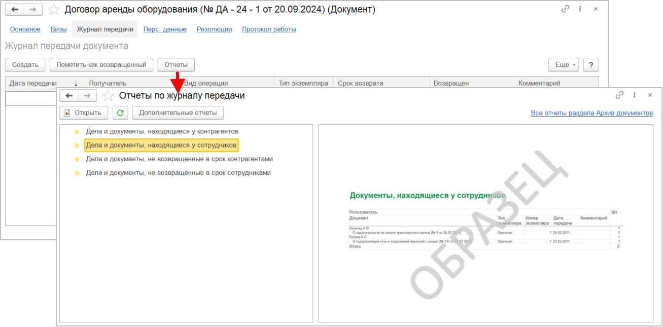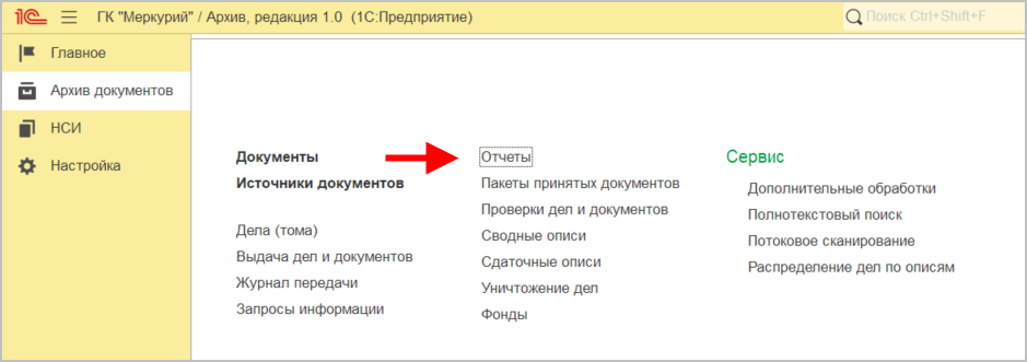 Отчеты доступны в разделе Архив документов – Отчеты, а также на закладке Журнал передачи – Отчеты карточек дел и документов архива.