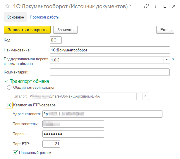 Для этого в карточке источника в группе Транспорт обмена необходимо выбрать пункт Каталог на FTP-сервере и заполнить соответствующие ему данные – указать параметры каталога на сервере, через который выполняется обмен: Адрес, Пользователь, Пароль, Порт FTP.