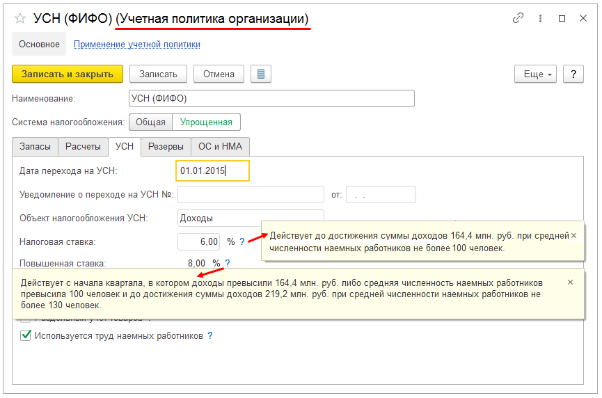 учетной политики, указать повышенную ставку налога УСН в поле Налоговая ставка и установить применение этой учетной