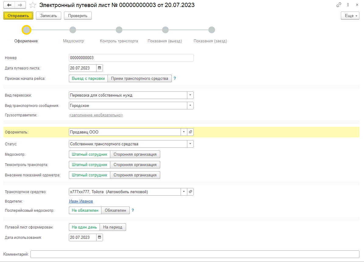 После внесения указанной информации можно сохранить черновик транспортного листа (кнопка Записать), проверить корректность заполнения (кнопка Проверить) и передать транспортный лист оператору ЭДО (кнопка Отправить). Если на момент оформления путевого листа еще не были заданы настройки отправки, то будет выведена форма настройки отпарвки.