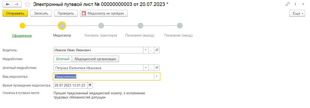 Последующие шаги: внесение результатов технического осмотра транспортного средства, внесение показаний одометра при выезде и при въезде также выполняются и подписываются соответствующими должностными лицами на своем рабочем месте с установленным сертификатом электронной подписи.