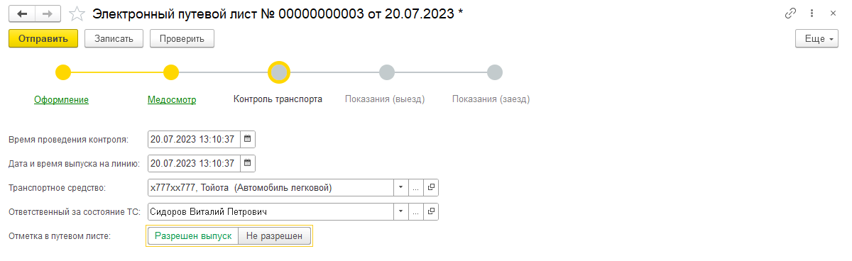 На шаге Контроль транспорта указывается результат контроля с помощью переключателя Разрешен выпуск / Не разрешен, после чего необходимо передать документ оператору ЭДО по