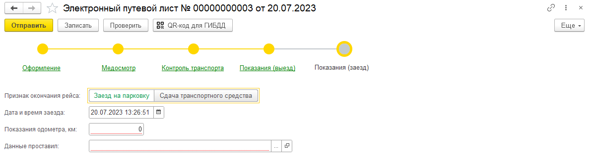 Помощник оформления путевого листа переходит при этом на заключительный шаг – внесение оказаний при заезде, который выполняется аналогично предыдущему, но уже после возвращения транспортного средства.