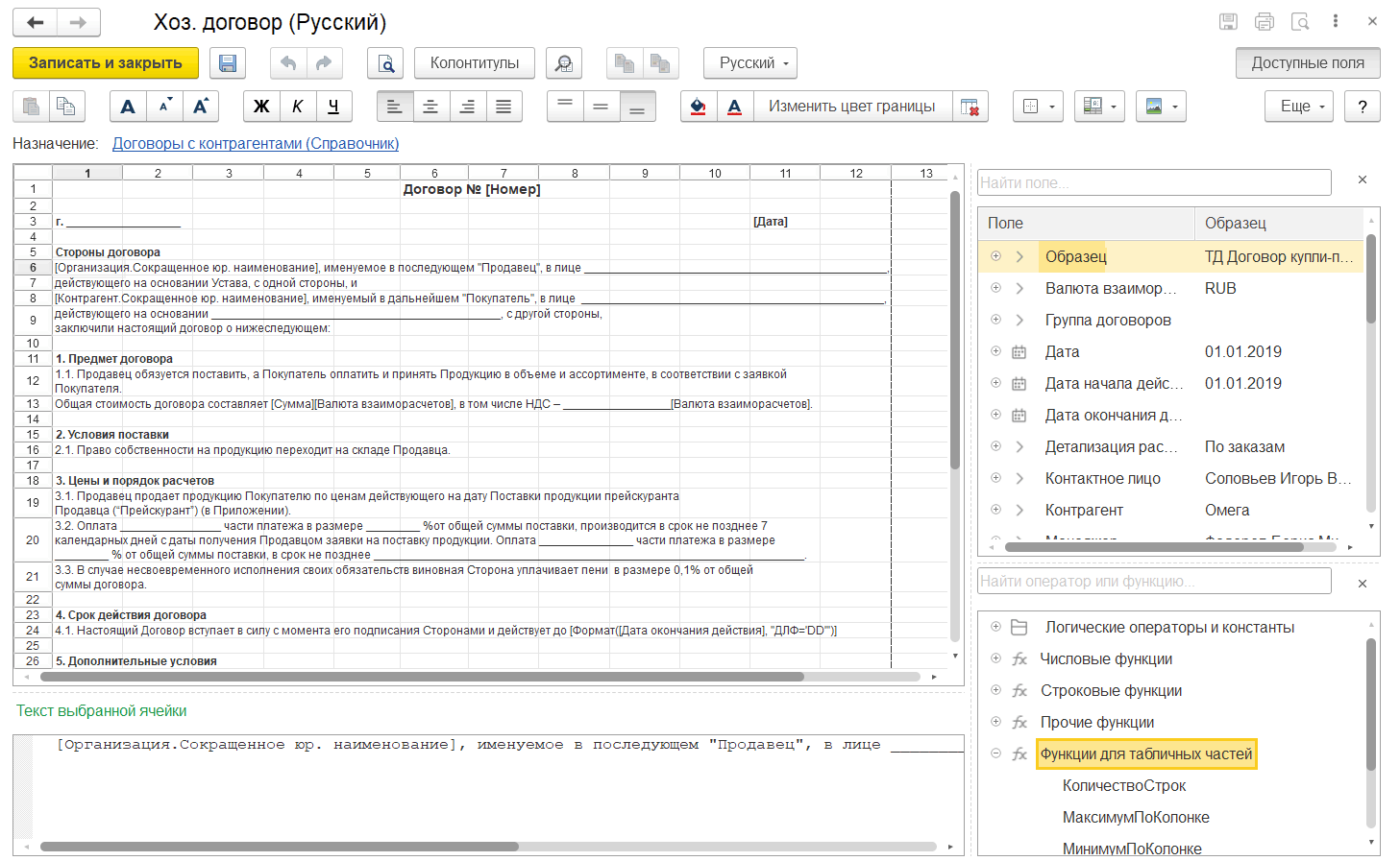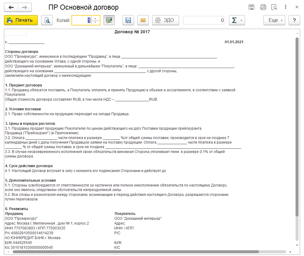 Организации часто с определенной группой контрагентов используют типовые договоры, в которых зафиксирована значительная часть условий договора. В этом случае при заключении нового договора с контрагентом основная часть условий будет соответствовать типовому договору. В договоре подставляются реквизиты конкретного контрагента, уточнятся сроки применительно к конкретному договору, иногда уточняются лишь отдельные специфические условия. Такой договор с контрагентом можно сформировать по заранее подготовленному шаблону. В шаблоне описываются формальные условия типового договора, а также указываются параметры для автоматического заполнения реквизитов и специфических условий договора.