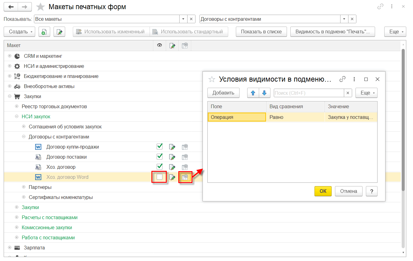 Новая печатная форма автоматически сохраняется в списке макетов без установки флага использования. Строка с макетом выводится серым цветом. При такой настройке созданная печатная форма не будет отображаться в меню Печать. Для начала использования формы необходимо установить флаг Показывать в меню печать в списке макетов печатных форм. Дополнительно можно задать условия доступности шаблона в списке команд печати в зависимости от значений реквизитов элементов, например, в зависимости от выбранного поля Операция.