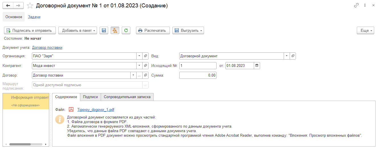 Для заключения электронного договора необходимо воспользоваться командой Утвердить, а затем Подписать и отправить. После выполнения информационного обмена с оператором ЭДО электронный документооборот по договору будет завершен, договор считается подписанным.
