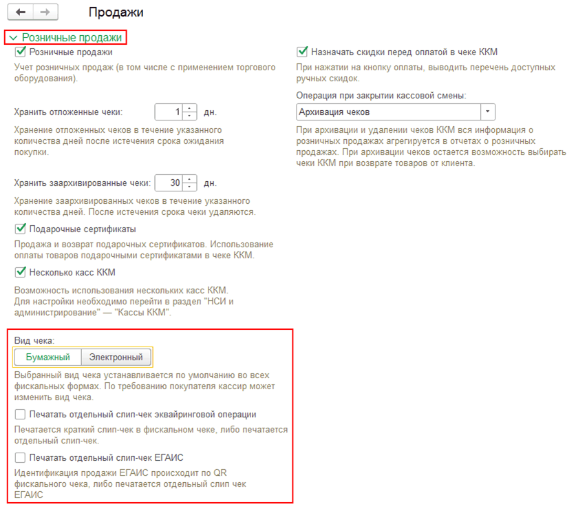 Настройка вида фискального чека по умолчанию, также видов слип-чеков эквайринговой операции и ЕГАИС выполняется в панели настройки розничных продаж: НСИ и администрирование - Настройка НСИ и разделов - Продажи - Розничные продажи.