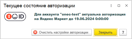 В форме настроек отображается аккаунт на торговой площадке Яндекс и далее под ним список магазинов, привязанных к этому аккаунту. Под названием аккаунта доступны ссылки Состояние авторизации и Обновить информацию о магазинах. По ссылке Состояние авторизации открывается информация о состоянии подключения с возможностью удаления авторизационных данных. По кнопке Очистить настройку авторизации запрашивается подтверждение. После удаления авторизационных данных потребуется повторное подключение к аккаунта для возможности работы с магазинами аккаунта.