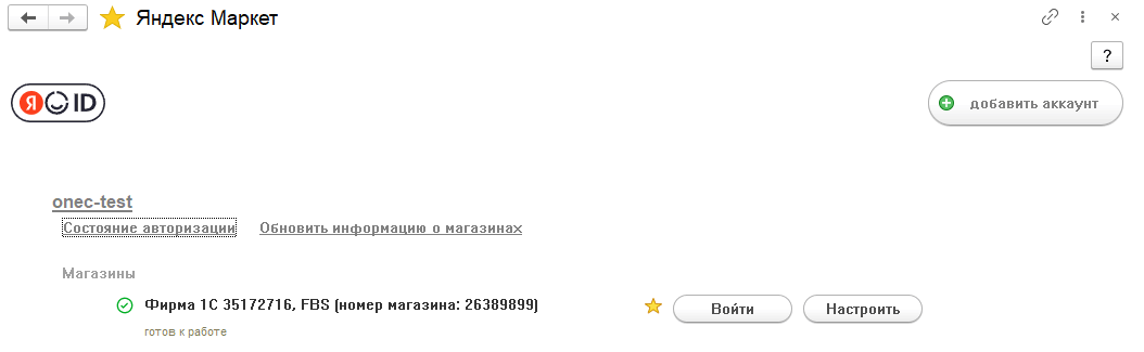 Возможность настройки аккаунтов и магазинов в контексте Яндекс Маркет это в большей степени бизнес-функция, чем административная, поэтому возможность настройки также доступна менеджеру в разделе Продажи – Сервис - Продажи на Яндекс Маркет. У менеджера рядом с каждым магазином также присутствует кнопка Войти, по которой можно начать обмен данными по этому магазину.