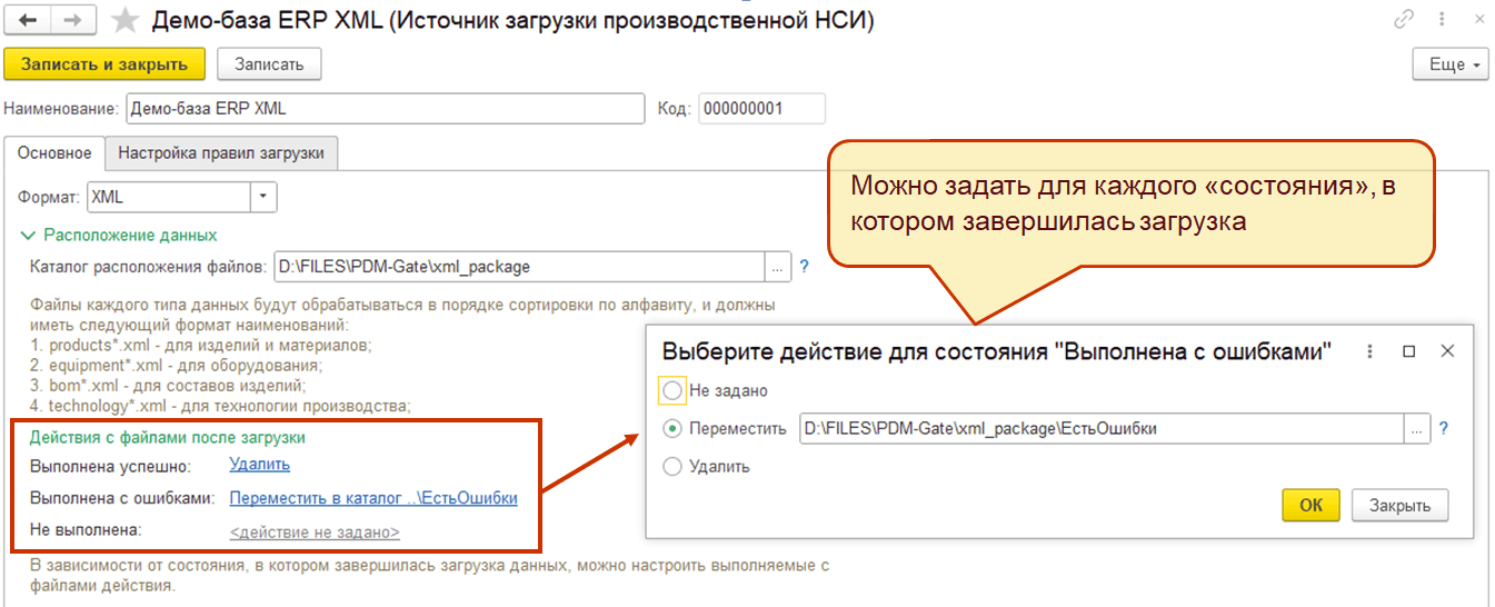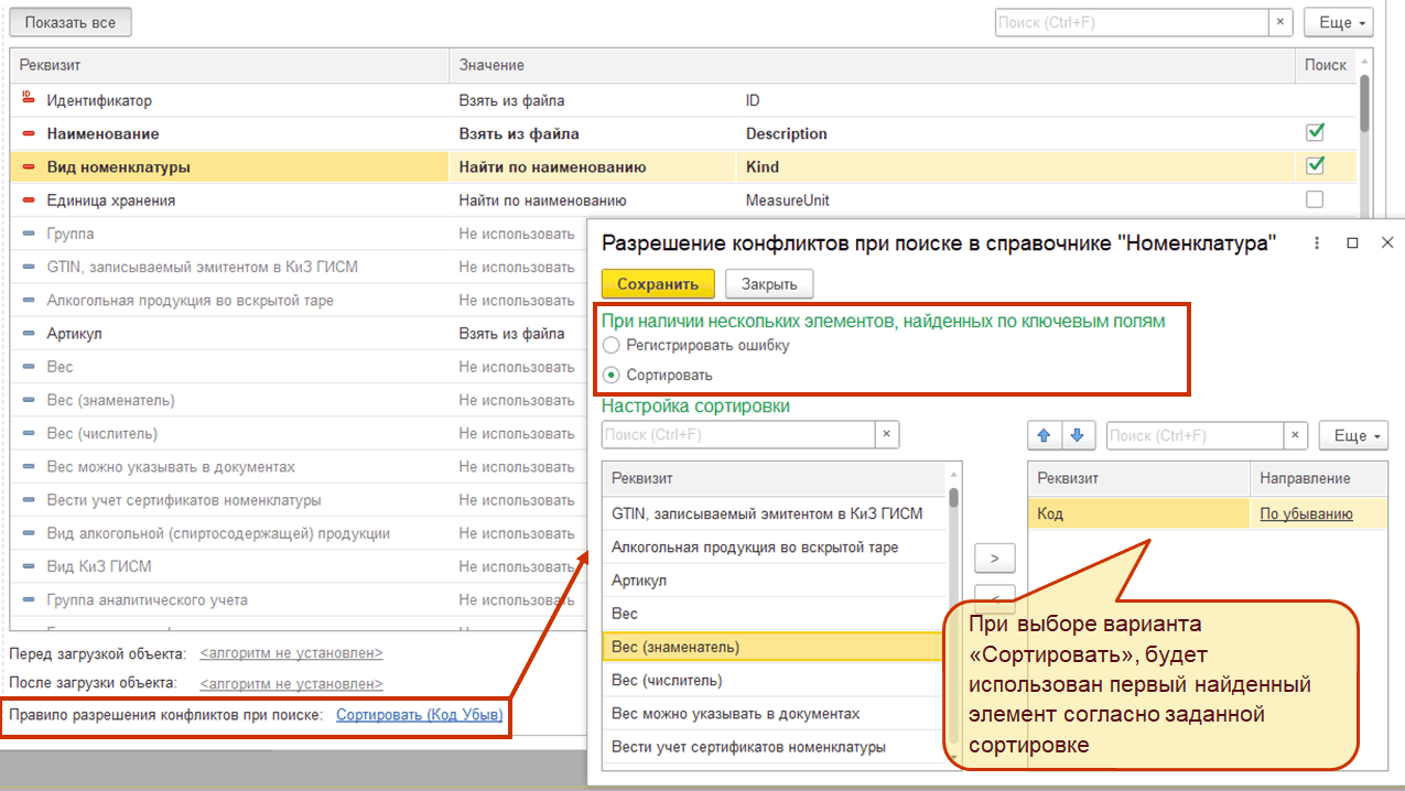 Можно настроить правила разрешения конфликтов, если по ключевым полям обнаружено несколько элементов. При выборе варианта “Регистрировать ошибку”, ошибка потребует рассмотрения в форме Мониторинга, а загрузка текущего элемента прекращается.