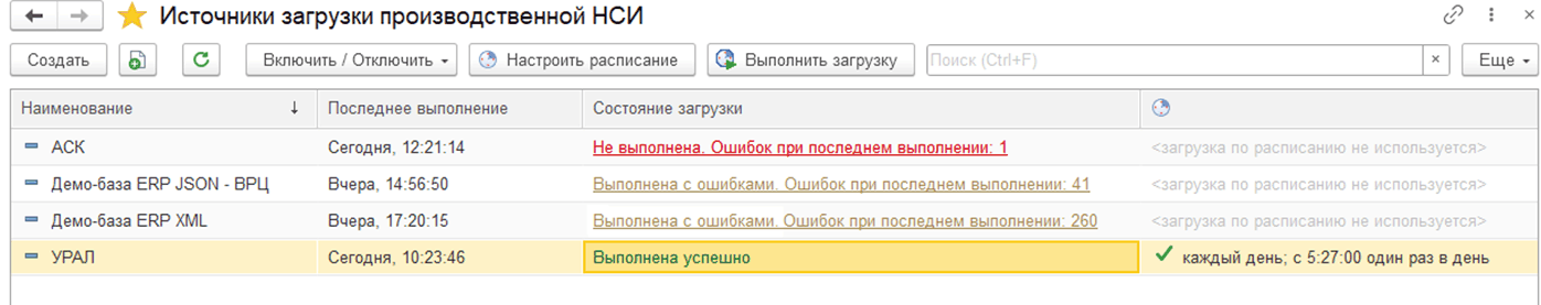 В списке источников загрузки в колонке “Состояние загрузки” цветом оформляется успешность выполнения. При наличии ошибок по гиперссылке из этой колонки можно перейти сразу в форму мониторинга загрузки с отбором по источнику данных: