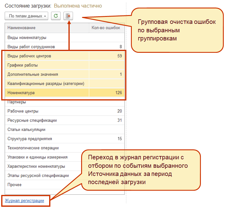 Из окна мониторинга можно по гиперссылке перейти в журнал регистрации с отбором по событиям выбранного источника за период последней загрузки. После анализа ошибок можно очистить ошибки сразу по всем выбранным строчкам: