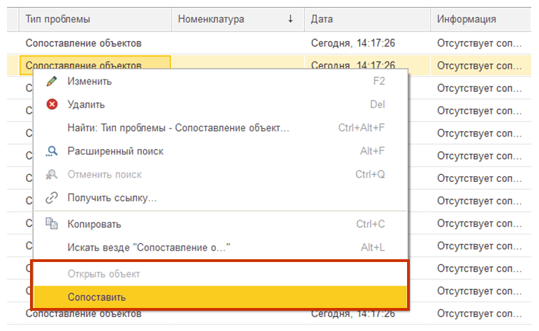 В контекстном меню списка проблем есть команды открытия объекта и ручного сопоставления: