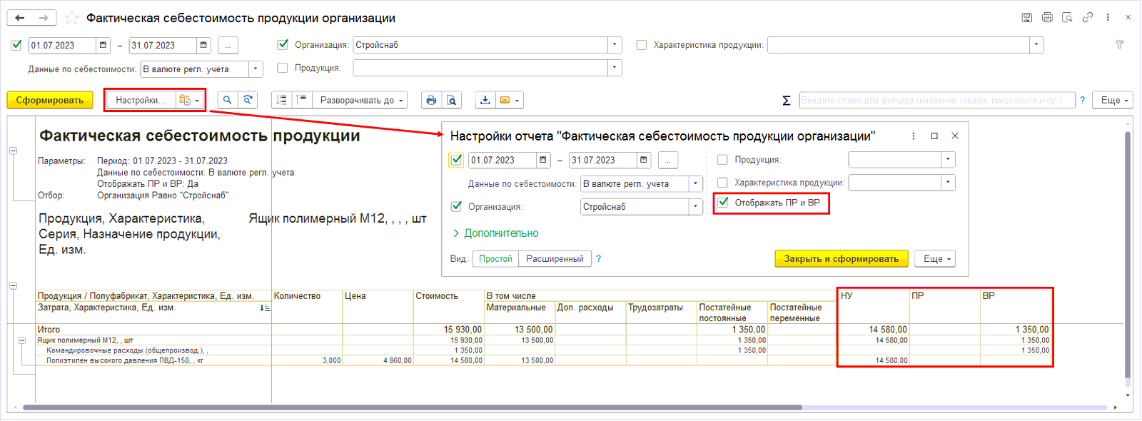 С целью расширения возможностей контроля и анализа себестоимости выпущенной продукции реализовано формирование отчетов Дерево себестоимости продукции организации и Фактическая себестоимость продукции организации по данным налогового учета. В настройку формирования указанных отчетов добавлен новый параметр Отображать ПР и ВР, при установке которого в отчеты выводятся графы НУ, ПР и ВР с указанием соответствующих сумм по данным налогового учета.