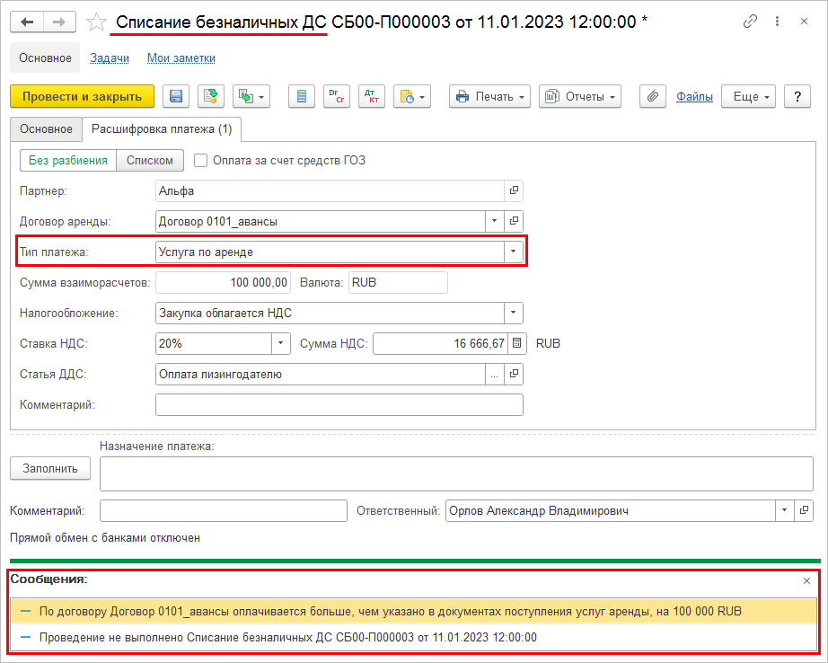 При выплате аванса арендодателю должен использоваться тип платежа Услуга по аренде (аванс). Не допускается выплата аванса при выборе типа платежа Услуга по аренде. Об этом в документе Списание безналичных денежных средств добавлено информационное сообщение.
