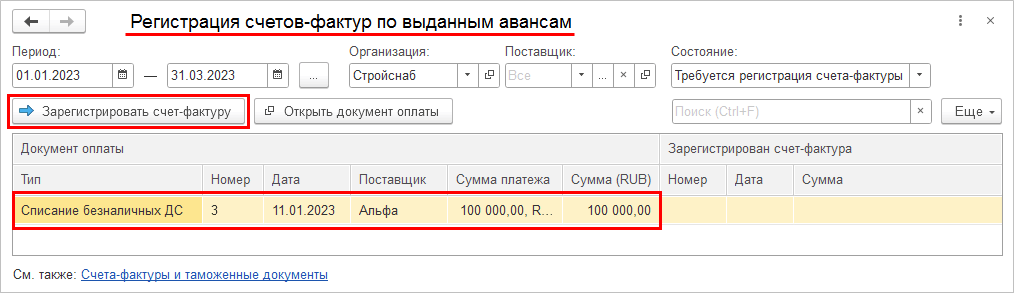 Поддержано формирование документов Счет-фактура полученный (аванс) по документам Списание безналичных денежных средств с типом платежа Услуга по аренде (аванс). Документы Счет-фактура полученный (аванс) могут быть сформированы в рабочем месте Регистрация счетов-фактур по выданным авансам