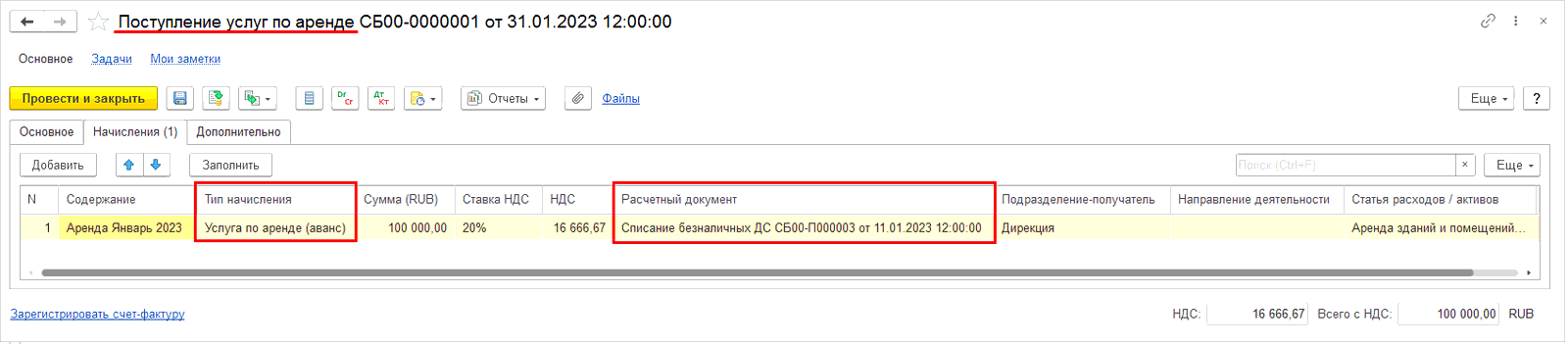 Для зачета авансов по текущим арендным платежам в документы Поступление услуг по аренде добавлен выбор типа платежа Услуга по аренде (аванс) и расчетного документа.