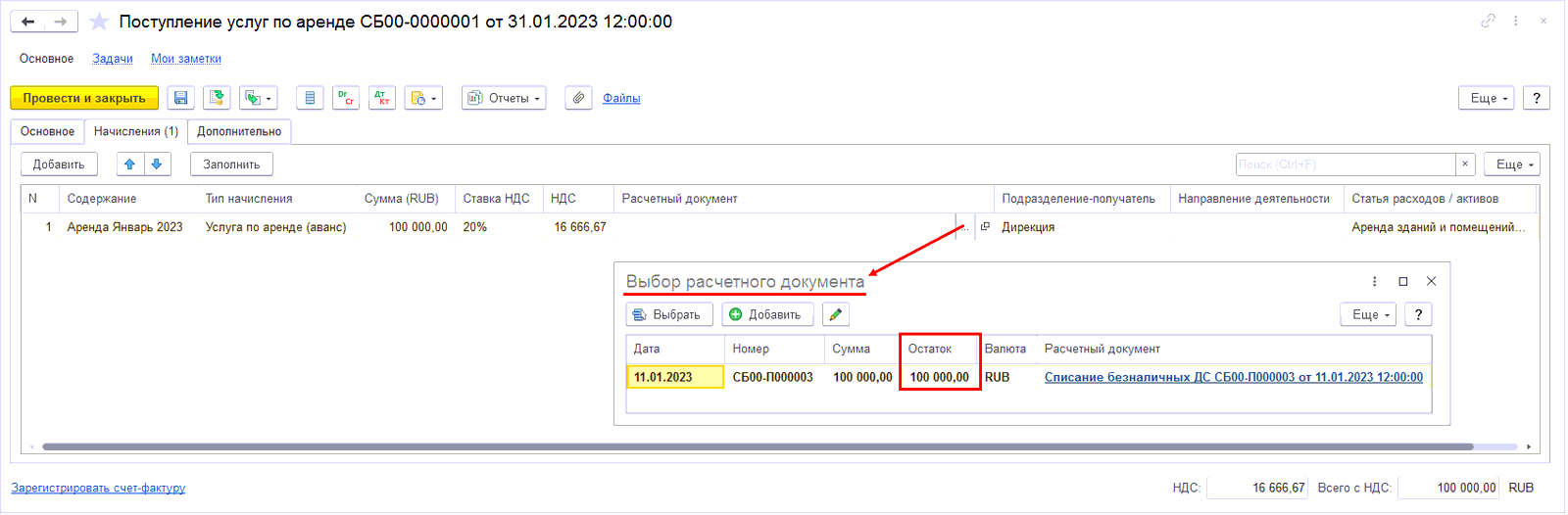 Для типа платежа Услуга по аренде (аванс) указание расчетного документа в табличной части документа Поступление услуг по аренде является обязательным. Сумма оставшегося аванса по расчетному документу контролируется по данным регистра накопления Расчеты по финансовым инструментам. При выборе расчетного документа в поле Остаток отображается незачтенный остаток аванса по договору аренды.