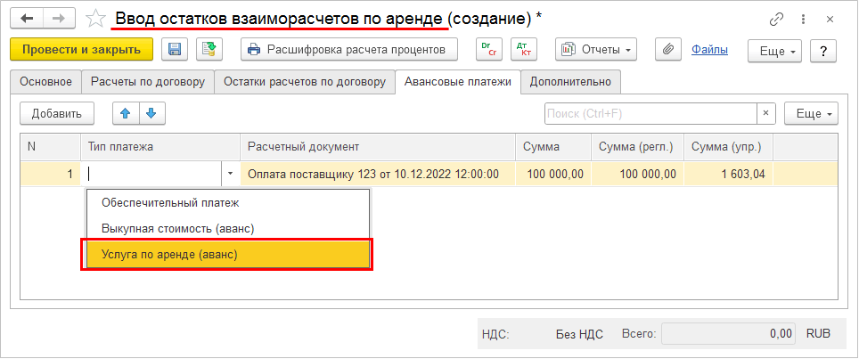 В документе Ввод остатков взаиморасчетов по аренде поддержана возможность выбора типа платежа Услуга по аренде (аванс) для внесения остатков авансов по текущим платежам по договорам аренды.