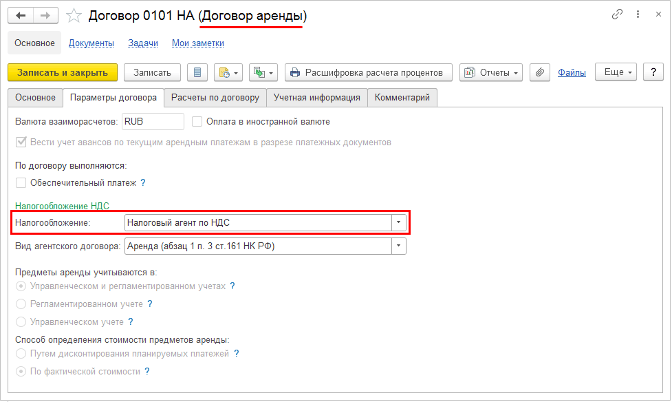 Налогообложение Налоговый агент по НДС доступно в карточке элемента списка Договоры аренды, если Цель договора определена как Аренда, балансодержателем является арендодатель и в учетной политике организации включен Учет аренды по ФСБУ 25/2018.