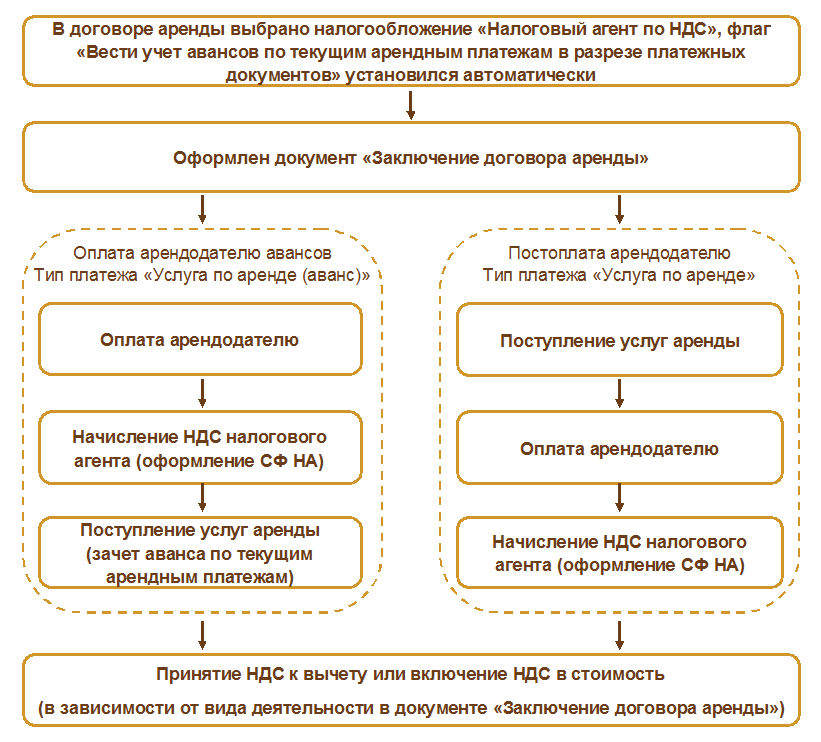 Сценарии оформления документов по аренде при исполнении организацией обязанностей налогового агента по НДС приведены на схеме.