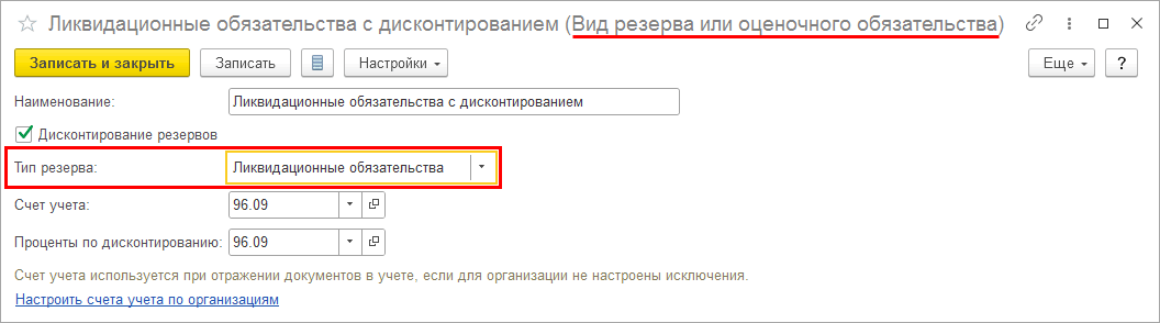 По гиперссылке Настроить счета учета по организациям в карточке элемента списка Виды резервов и оценочных обязательств счет учета процентов по дисконтированию может быть уточнен для организаций, учет по которым ведется в информационной базе.