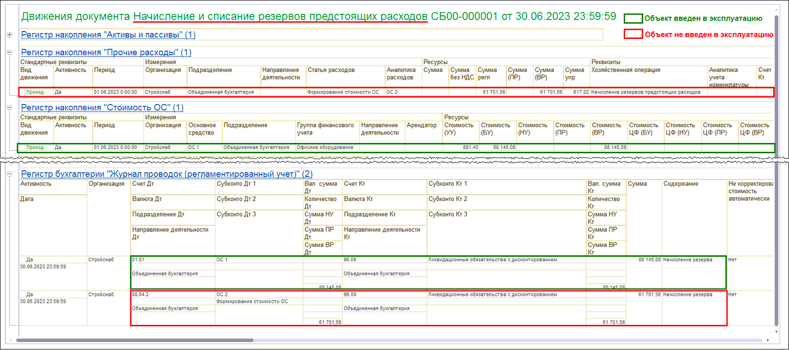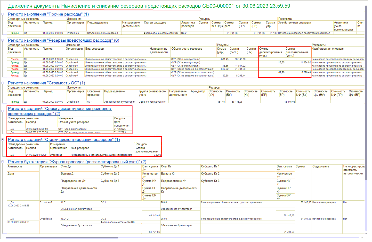 Если в документе Начисление и списание резервов предстоящих расходов указана ставка дисконтирования, то документ делает движение в новый регистр сведений Ставки дисконтирования резервов и отражает хозяйственную операцию по пересчету будущих процентов с отнесением на объект внеоборотных активов.