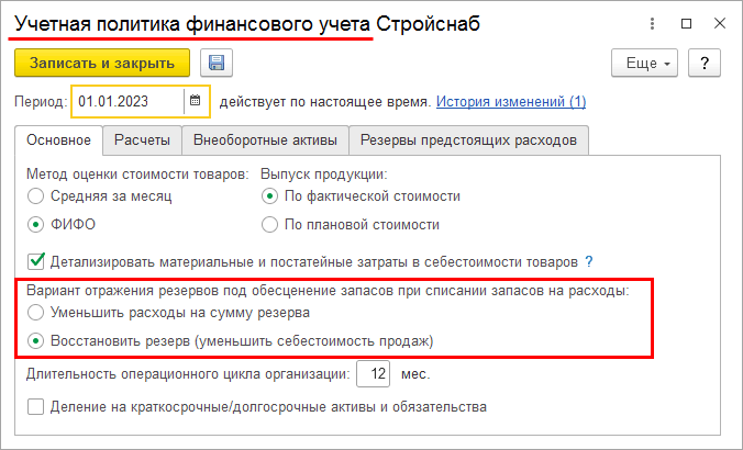 В блок Учетная политика финансового учета учетной политики организации добавлен переключатель Вариант отражения резерва под обесценение запасов при списании запасов на расходы.