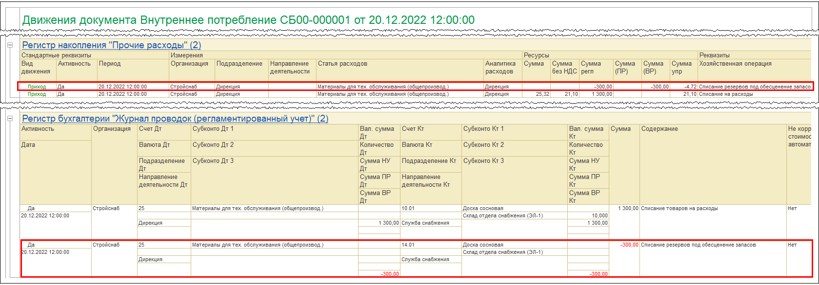 При уменьшении суммы резерва движения в регистры и проводки формируются со знаком «-».