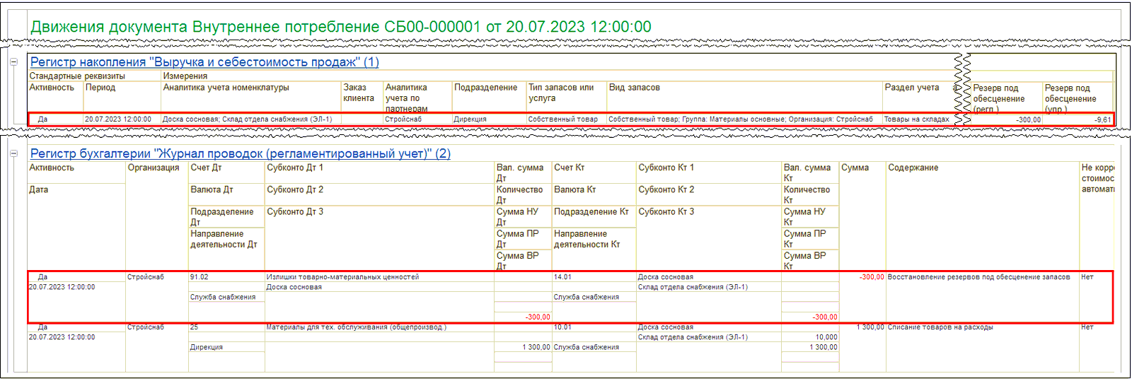 При установке переключателя Вариант отражения резерва под обесценение запасов при списании запасов на расходы в значение Восстановить резерв (уменьшить себестоимость продаж) при отнесении стоимости ТМЦ на расходы сумма начисленного резерва будет восстановлена. На сумму резерва со знаком «-» будет сделана запись в регистр накопления Выручка и себестоимость продаж и при отражении документа в регламентированном учете будет сформирована проводка вида Сторно Дт Себестоимость продаж из ГФУ номенклатуры Кт Счет учета резерва под обесценение из ГФУ номенклатуры или указанный для запасов в кладовых.