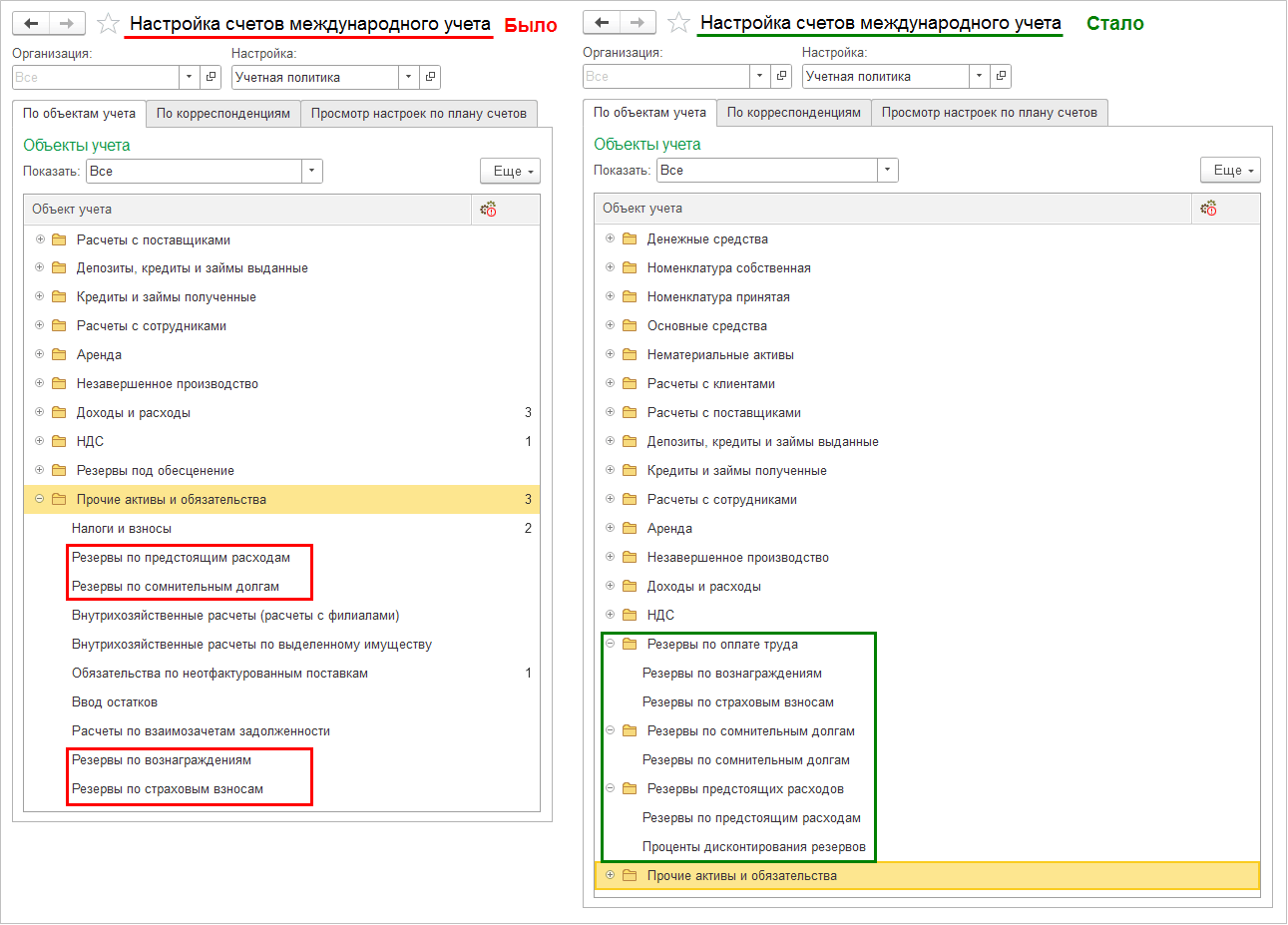 Внесены изменения в рабочее место Настройка счетов международного учета. Из группы объектов учета Прочие активы и обязательства элементы перенесены в новые группы: Резервы по вознаграждениям и Резервы по страховым взносам в группу Резервы по оплате труда, Резервы по сомнительным долгам в группу Резервы по сомнительным долгам и Резервы по предстоящим расходам в группу Резервы предстоящих расходов.