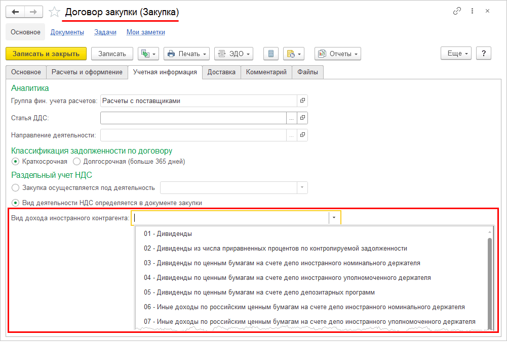 Поле Вид дохода иностранного контрагента отображается в карточке элемента списка Договоры контрагентов, если страна регистрации контрагента не Россия. Если реквизит Вид дохода иностранного контрагента в договоре не заполнен или расчеты с контрагентом ведутся без указания договора, суммы платежей будут отражены в разделе 4 отчета «Налоговый расчет о суммах выплаченных иностранным организациям доходов и удержанных налогов» без указания кода дохода.