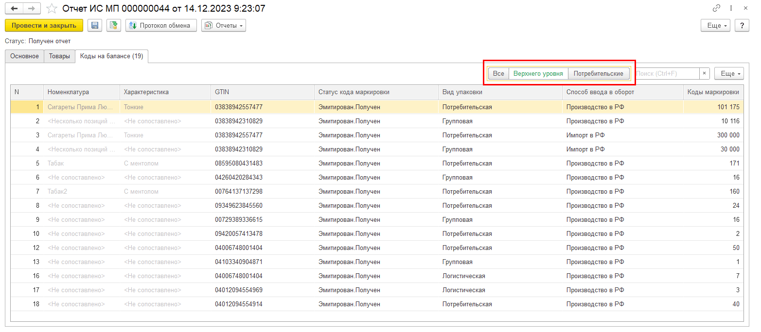 ■ Верхнего уровня – отображаются только коды, для которых в выгрузке не указана родительская упаковка. Это могут быть упаковки любого вида, в том числе, потребительские, если они не были агрегированы или были разагрегированы;