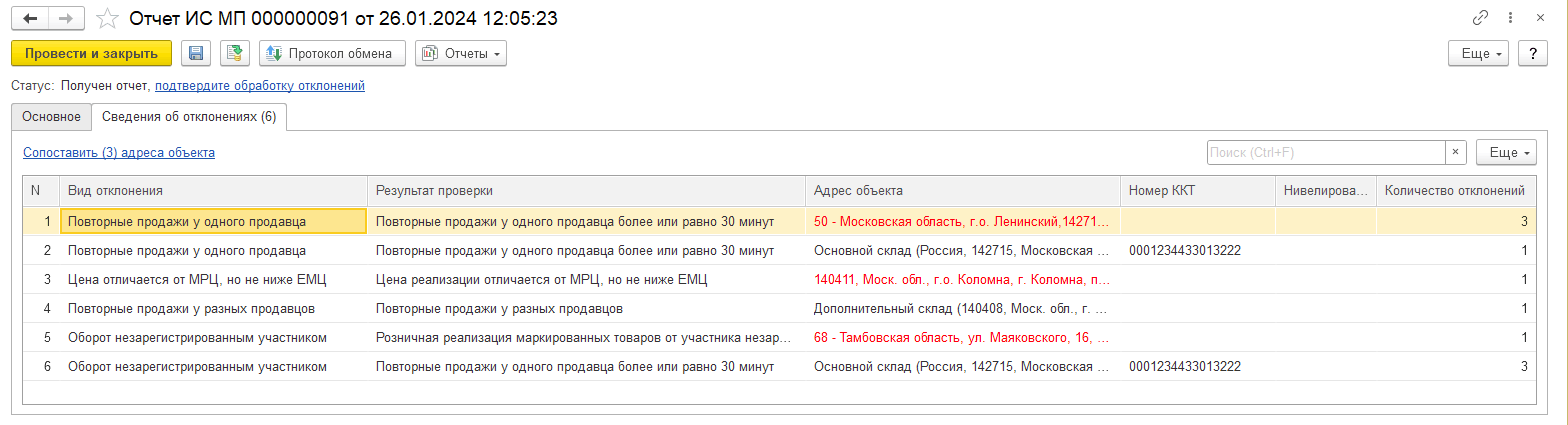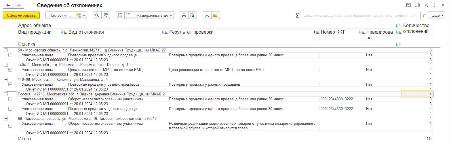 Данные выгрузки можно посмотреть в форме отчета. Отчет Сведения об отклонениях доступен из формы документа и из формы списка документов Отчеты ИС МП. По умолчанию отчет формируется с детализацией до адреса, вида продукции, вида отклонения, результат проверки, номера ККТ и общего числа отклонений данного вида. По полю Количество отклонений доступна расшифровка до кода маркировки.