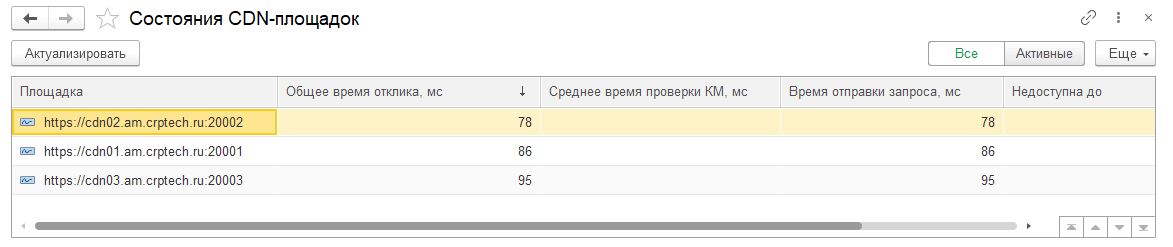 По кнопке Актуализировать запускается общая процедура обновления списка CDN-площадок и загрузка времени их отклика для выявления наиболее быстрой площадки.