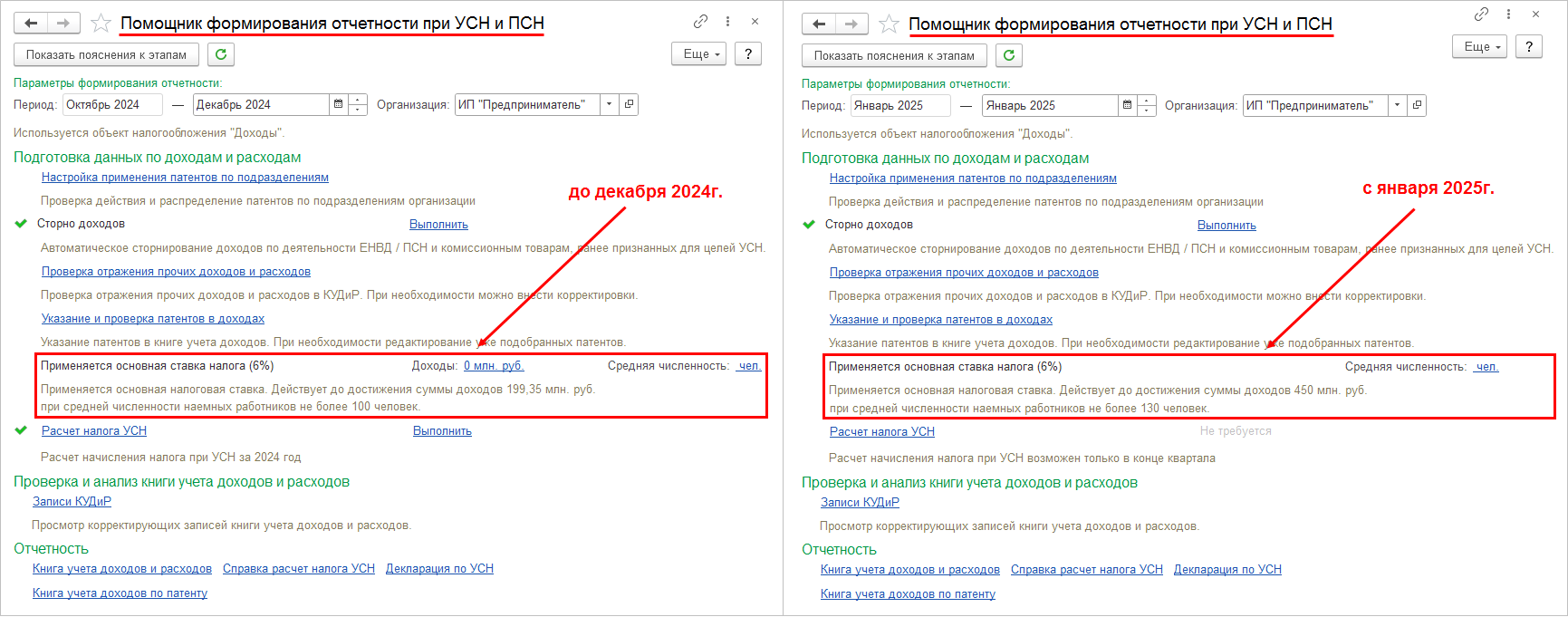 В связи с принятием Федерального закона от 12.07.2024 № 176-ФЗ с 01.01.2025г. с 01.01.2025г. отменена прогрессивная шкала ставок налога, уплачиваемого при применении УСН. В рабочем месте Помощник формирования отчетности при УСН и ПСН изменено содержание информационных сообщений о применяемых организацией на УСН ставках налога.