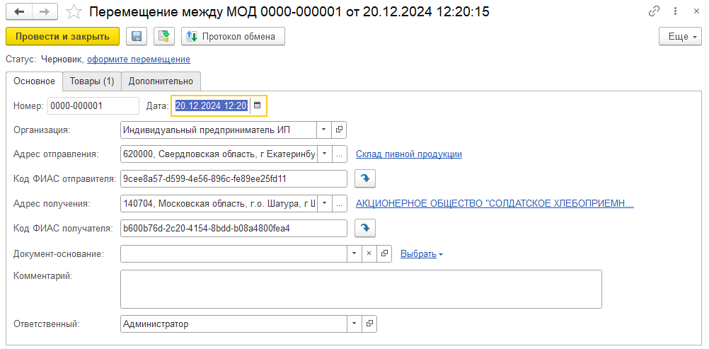 В случае перемещения между МОД индивидуального предпринимателя указываются адреса отправления и получения