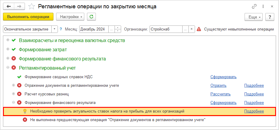 Если в информационной базе нет введенных на 01.01.2025г. значений ставок налога на прибыль, тогда в рабочем месте Регламентные операции по закрытию месяца в периодах Декабрь 2024г. и Январь 2025г. будет выводиться сообщение о необходимости проверить актуальность ставок налога на прибыль.