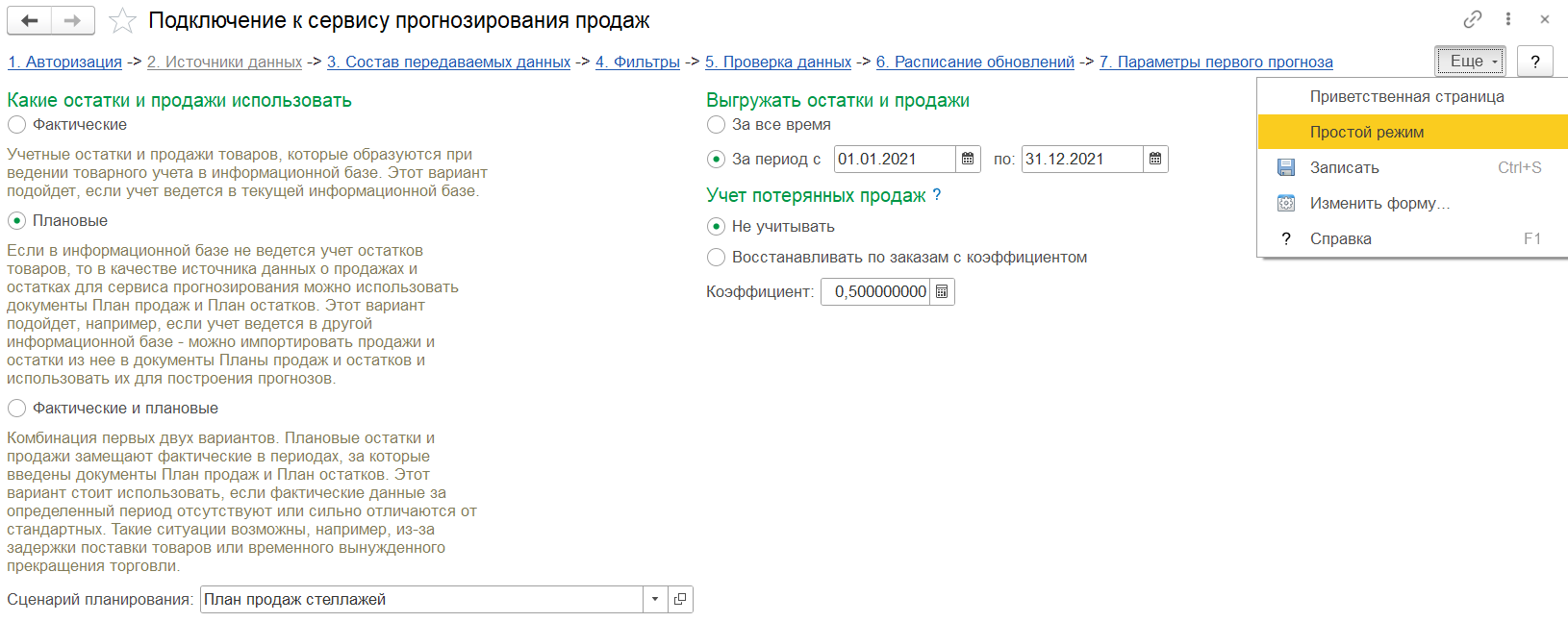 По умолчанию помощник подключения к сервису (Бюджетирование и планирование – Сервис – Сервис прогнозирования продаж, гиперссылка Помощник подключения к сервису) открывается в простом режиме.