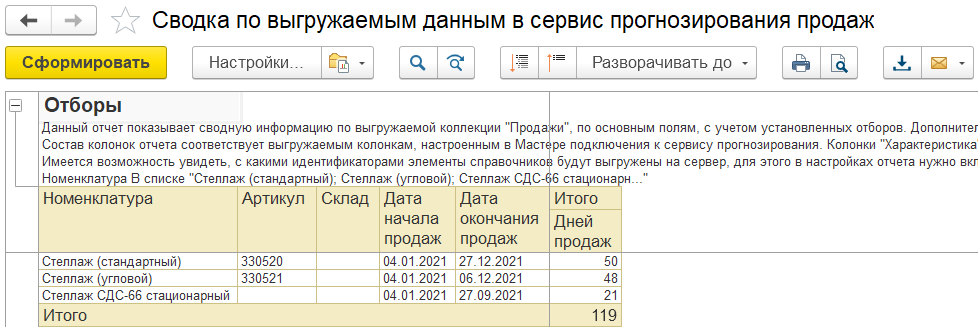■ Перед выгрузкой данных в сервис прогнозирования и построением прогноза возникает необходимость проверить корректность выгружаемых данных. Отправляются ли на сервер продажи по товарам, по которым ожидается прогноз? И напротив, не выгружаются ли позиции, давно выведенные из оборота? Для такой возможности реализован отчет по выгружаемым данным.