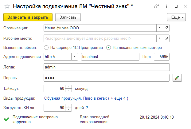 В случае внесения изменения в список учитываемых видов продукции или количества дней выгрузки карточек необходимо повторно передать данные в Локальный модуль «Честный знак» в карточке настройки подключения ЛМ "Честный знак" по ссылке Синхронизировать виды продукции.