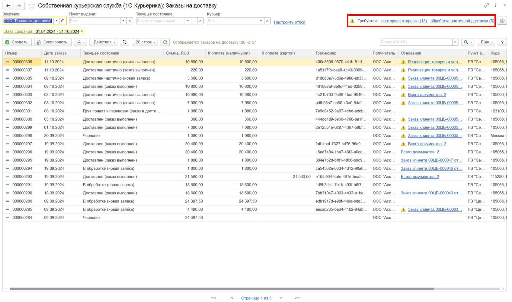 При получении информации о частичной доставке в форме списка Собственная курьерская служба (1С-Курьерика): Заказы на доставку отображаются ссылка обработка частичной доставки (X) с указанием количества документов, а в графе Основание в соответствующих строках документов, по которым требуется отражение частичной доставки, отображается пиктограмма с восклицательным знаком.
