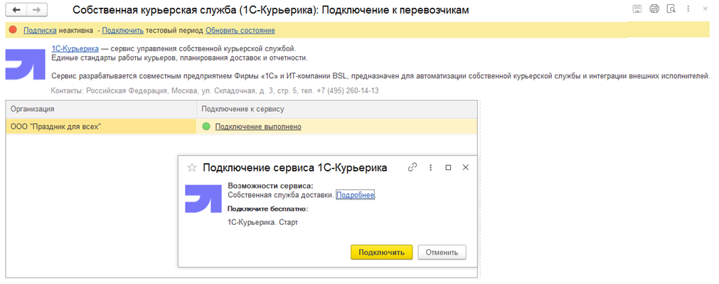 Для новых пользователей предусмотрен тестовый период. Тестовую опцию можно подключить без входа в личный кабинет портала 1С сразу из программы.