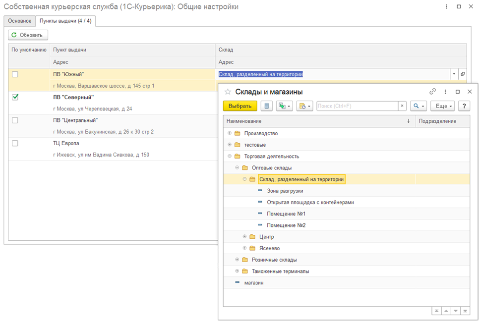 В графе По умолчанию устанавливается флаг для пункта выдачи по умолчанию. По кнопке Обновить производится принудительное обновление пунктов выдачи из сервиса "1С-Курьерика".
