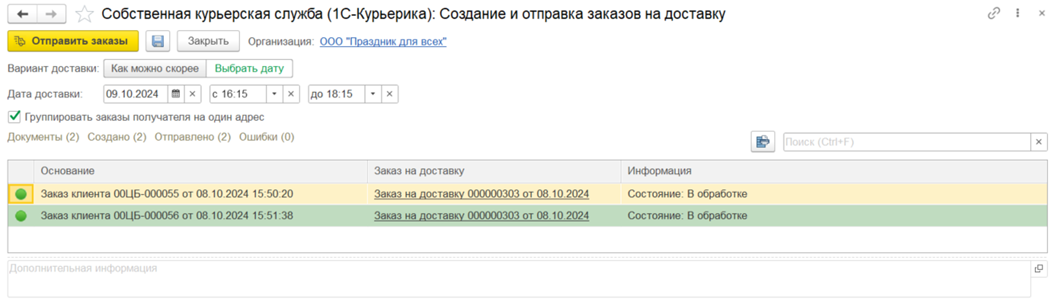 При создание заказов в форме Собственная курьерская служба (1С-Курьерика): Создание и отправка заказов на доставку по документам-основаниям, удовлетворяющим указанным выше условиям, будет создан один заказ на доставку.