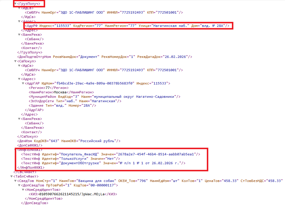В электронный документ добавляется тег Покупатель_ФиасИД, если адрес <ГрузПолуч> указывается в формате  АдрРФ в <ГрузПолуч> или ИдНом, если адрес <ГрузПолуч> указывается в формате <АдрГАР>.