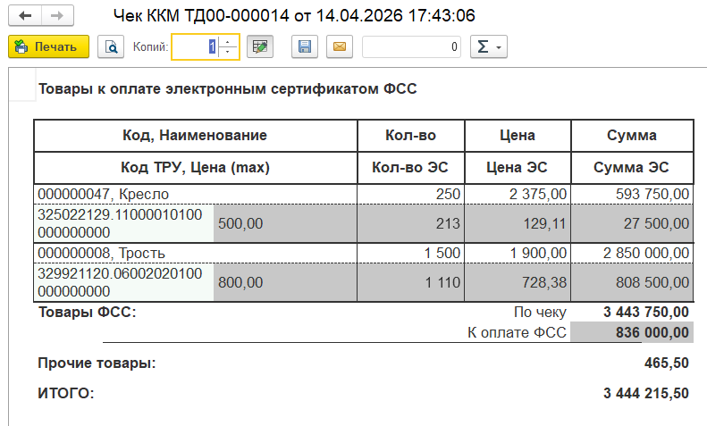 В документе Чек ККМ в таблице Товары предусмотрена графа Использован сертификат ФСС, которая заполняется по факту получения данных из НСПК об использовании сертификатов ФСС в момент оплаты.